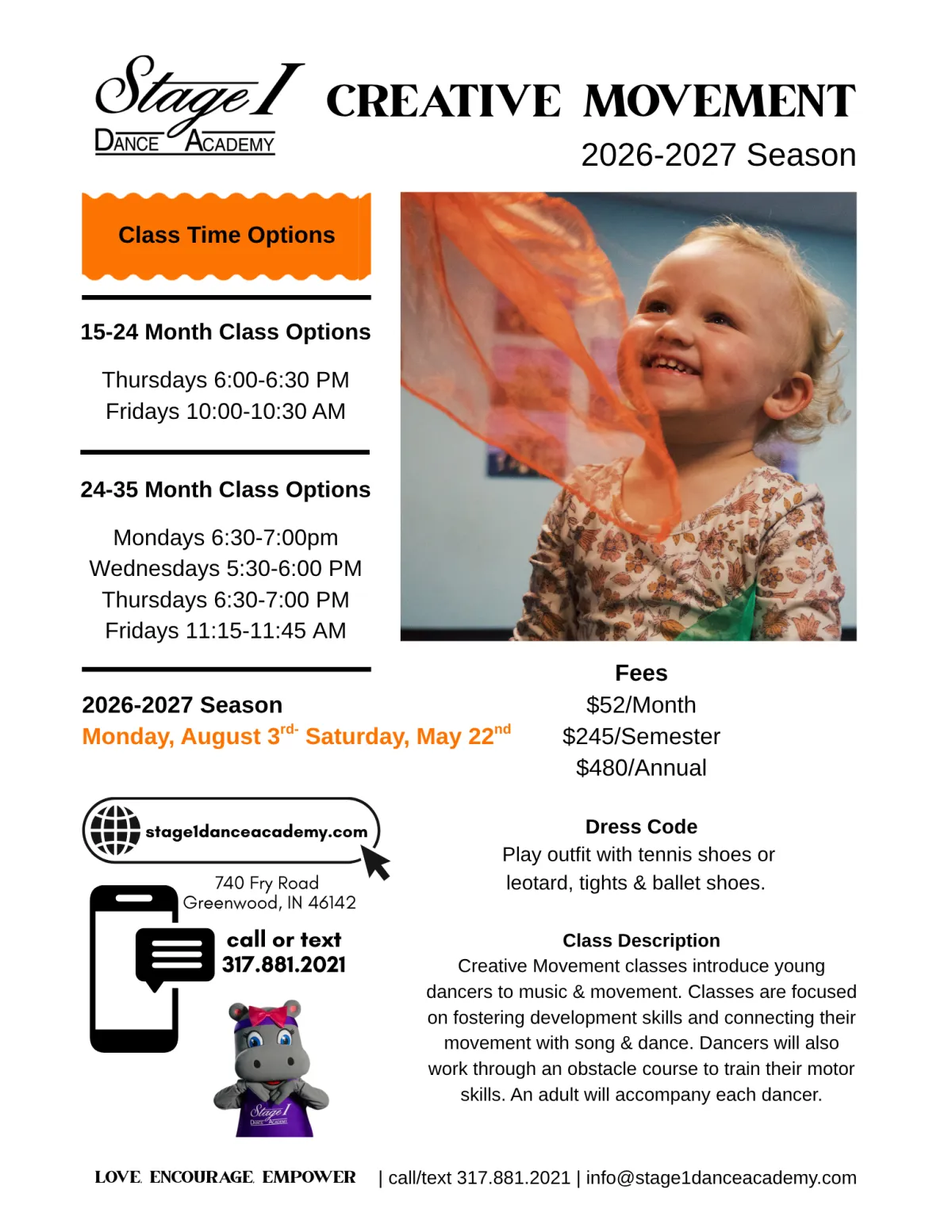 Creative movement classes introduce young dancers to music and movement. Our creative movement classes are focused on fostering development skills with young movers and connecting their movement with song and dance. In addition, young dancers will work through an obstacle course to train their motor skills.